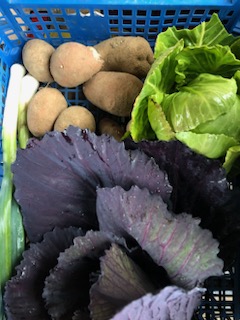 - Panier à 5 € avec : 500g de pommes de terre bio, 1 poireau bio, 1 bouquet de feuilles de chou rouge et vert bio, 1 oignon bio